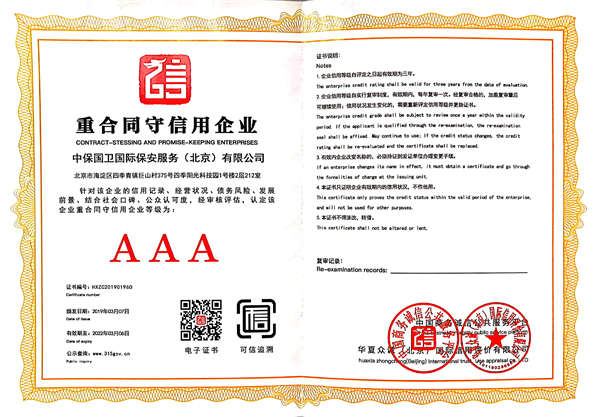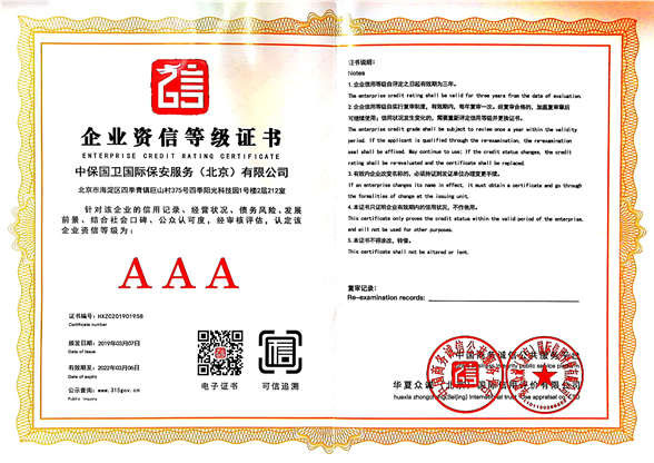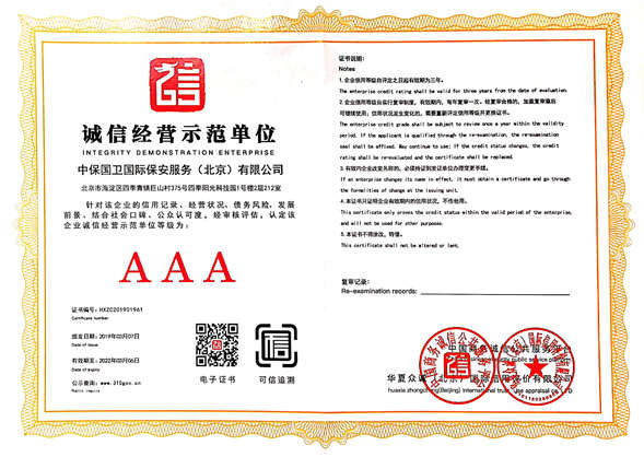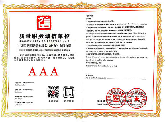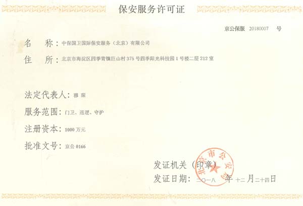 中保國衛(wèi)國際保安服務(北京)有限公司,屬中保國衛(wèi)集團旗下子公司。能全方位的為大型客戶提供優(yōu)質的安保、押運服務,是集人防和技防于一體的新型正規(guī)化綜合安保押運服務企業(yè),提供人防、物防、技防、聯(lián)網報*、非武裝押運等安防相關的一站式服務。 公司在國內多省設立有分公司及分支機構,著重提升安全押運、智能技術押運及安全技術防范相關的服務,業(yè)務范圍覆蓋全國一、二線城市、港澳地區(qū)以及海外地區(qū)。安保方面主要為政府機構、金融機構、企事業(yè)單位、醫(yī)療衛(wèi)生、高等院校、工業(yè)園區(qū)、大型商場、高檔住宅、智能商務樓、大型活動提供門衛(wèi)、守護、巡邏、押運(非武裝)、安全檢查、保安特勤、私人護衛(wèi)、消防中控、安全技術防范、遠洋護航等全方位服務,同時面向國際市場,為中資企業(yè)在“一帶一路”沿線國家投資提供境外安保服務。 >> 更多內容 |